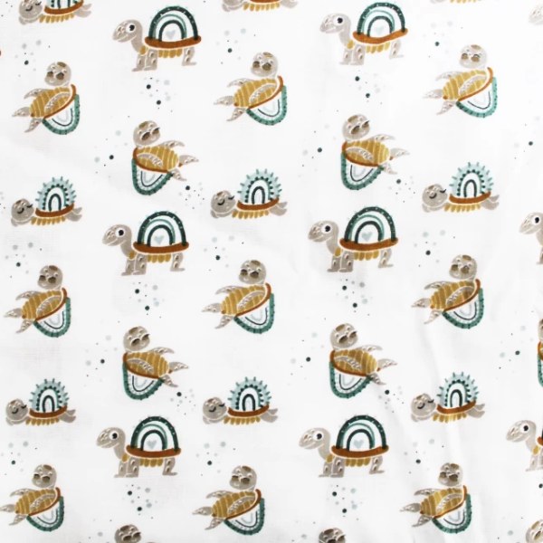 This fabric features cutesy turtles having a swimmingly time amongst cluster dots, sitting against a plain white background.