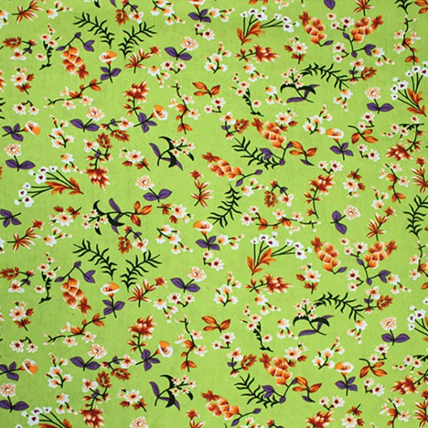 Featuring ditsy flowers and long stems of leaves on a background of lime, orange, and sky.